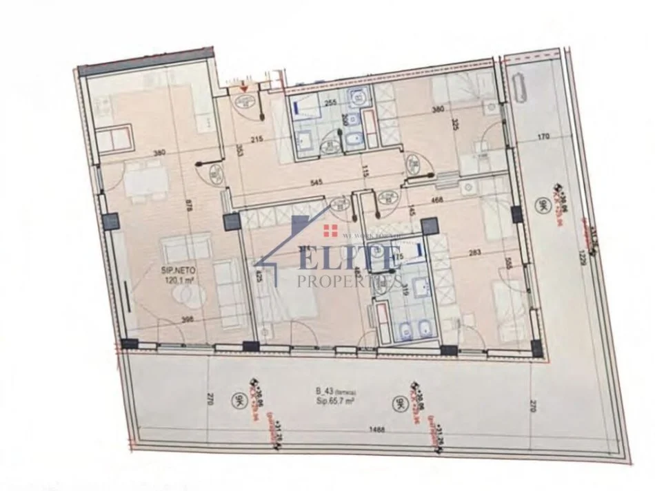 Apartamenti ka një sipërfaqe bruto prej 135.69 m2, sipërfaqe neto 120.10 m2 dhe sipërfaqe 65.7 m2