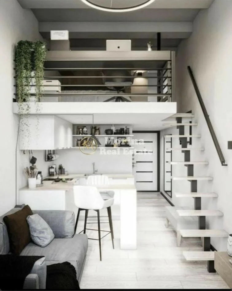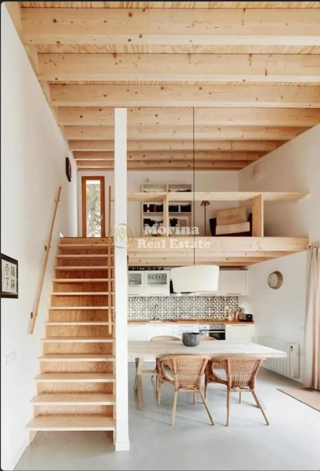 Ambienti eshte i larte 3,8 metra dhe dhe ndahet ne forme duplex ku pjesa siper sherben per fjetje dhe poshte living, mini kuzhine dhe banjo.