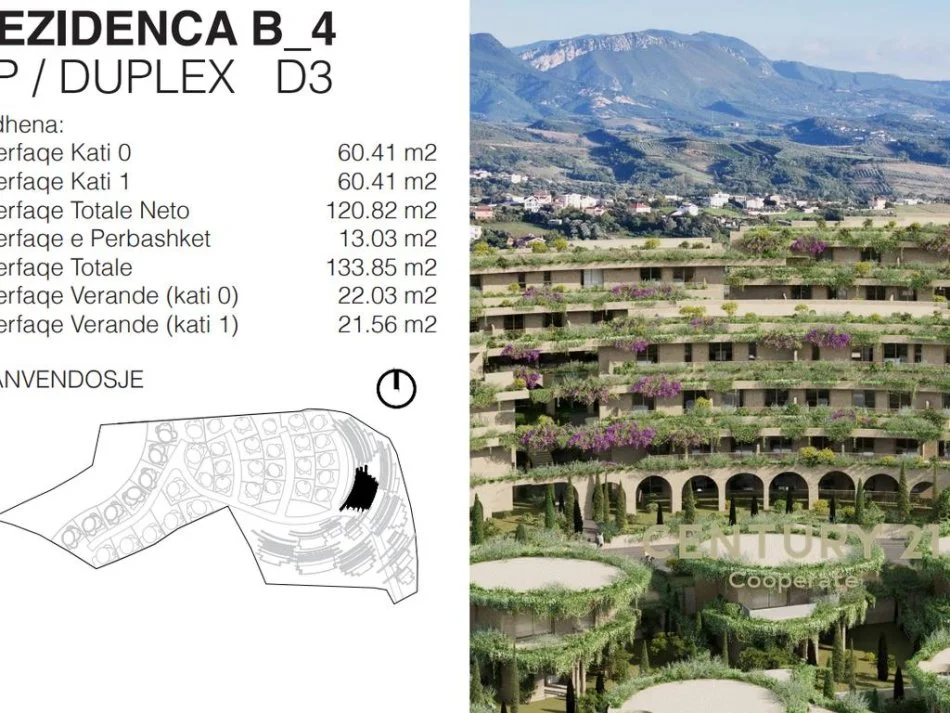 Ne rezidencen me te re te konceptuar nga arkitekti zvicerian Davide Macullo shitet Dubleks modern me 4 dhoma gjumi dhe 3 tualete, në zonën e Liqenit të Farkës, Tiranë. Me sipërfaqe totale 134 m² (121m² neto). Përfshin verandë prej 42 m², dy kate (kati përdhe dhe i parë), sallon të bollshëm dhe pamje të hapura nga liqeni dhe kopshti.