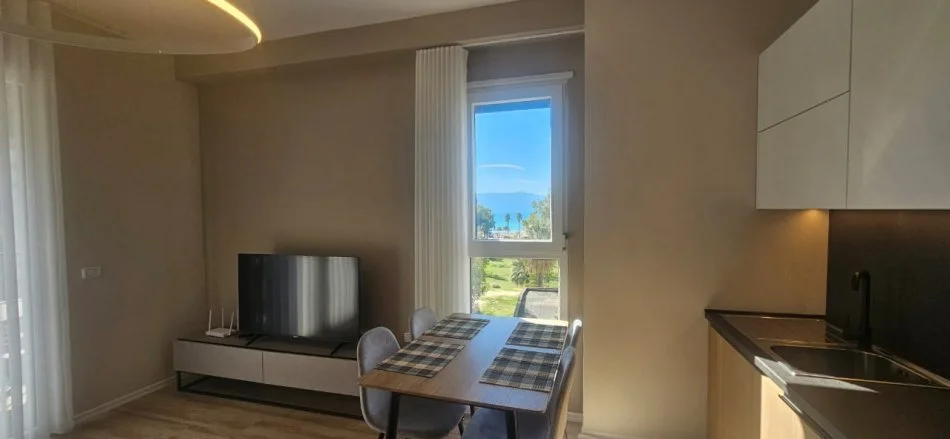 1 dhome gjumi, një ambient ndenjeje me kuzhinën, 1 tualet dhe ballkon që ofron pamje panoramike nga deti dhe mali.